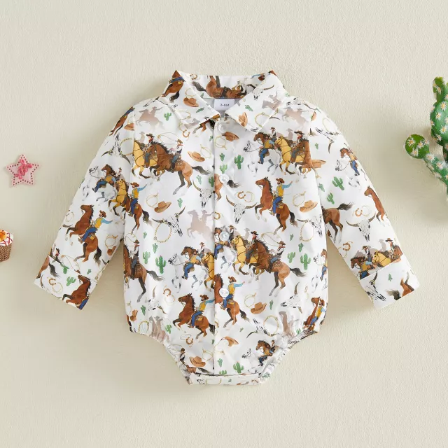 Dress your baby boy in charming western fashion with this cozy collared romper. Featuring a playful cowgirl-inspired print and a classic button-up design, this outfit brings fun, comfort, and style together in one easy-to-wear piece. The long sleeves keep your little one warm during cooler spring days, while the soft fabric feels gentle against delicate skin. Whether it’s for everyday wear, family outings, or adorable photo moments, this romper makes your baby look effortlessly cute.