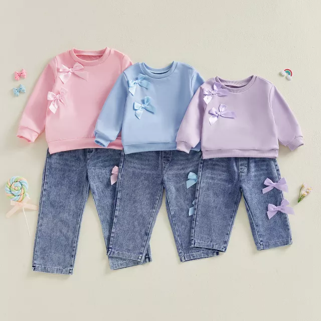 Dress your little one in this charming two-piece outfit designed to provide comfort and style. Perfect for toddler girls, this set includes a cute bow decorated long sleeve top paired with soft, stretchy elastic waist jeans. Whether for autumn or spring outings, your toddler will be cozy and fashionable all day long. Featuring playful details and high-quality materials, this outfit is ideal for any casual occasion!