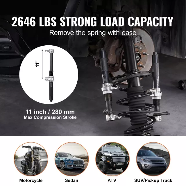 Engineered with a massive 2646 lb load capacity, this spring compressor is made to handle high-tension springs found in cars, trucks, SUVs, ATVs, and more. The wide compression range and long 11-inch stroke allow you to work on various spring sizes without switching tools. Crafted from hardened steel and heat-treated for durability, it resists bending, cracking, and wear even during repeated use.