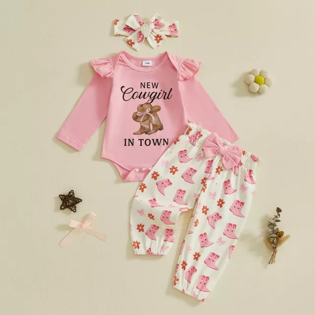 Dress your baby girl in sweet springtime charm with this cozy and stylish 3-piece outfit set. Designed for comfort, cuteness, and everyday wear, this outfit includes a long-sleeve letter print jumpsuit, soft elastic waist pants, and a matching bow headband. The soft pink color and playful boot-themed lettering create a look that feels both trendy and timeless. Whether it’s a family outing, a playdate, or a photo session, your little one will look absolutely precious.
