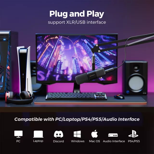 The included boom arm makes it easy to place the microphone exactly where you need it. Adjust it smoothly to reduce desk vibrations and free up valuable workspace. Speak comfortably while keeping your setup organized and professional-looking.