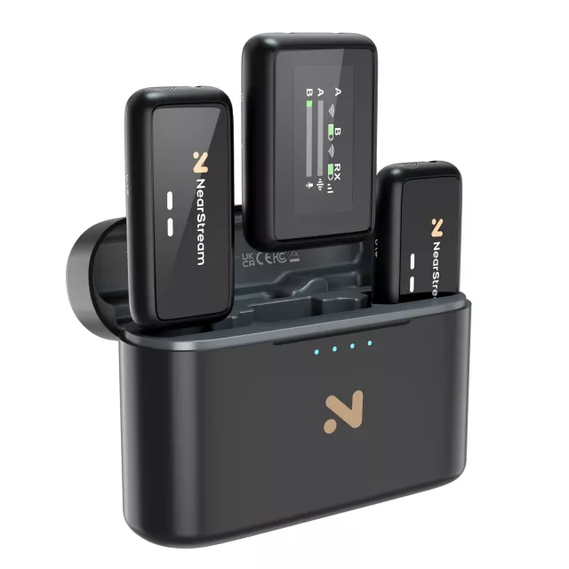This wireless microphone system is made to move with you. In open, unobstructed areas, it can transmit audio up to 2,150 feet in one direction and up to 540 feet in reverse, giving you exceptional flexibility on stage or in large rooms. Setup is fast and intuitive, so you can focus on speaking instead of adjusting settings. A compact charging case keeps everything organized and ready to go.